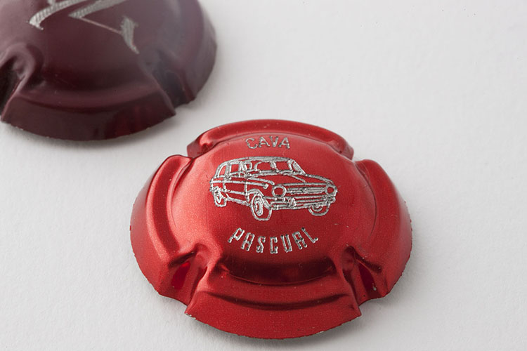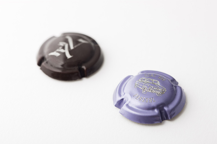 La grabación milimétrica de placas o chapas para embotellados (cava, champán, sidra…) se realiza con equipos que, a través de un haz de luz láser o mediante un diamante, permiten plasmar su diseño sobre el metal. El desgaste producido por la incidencia del sistema de grabado en las placas de cava, eliminando la capa de pintura o de color, ofrece unos detalles de alta precisión.